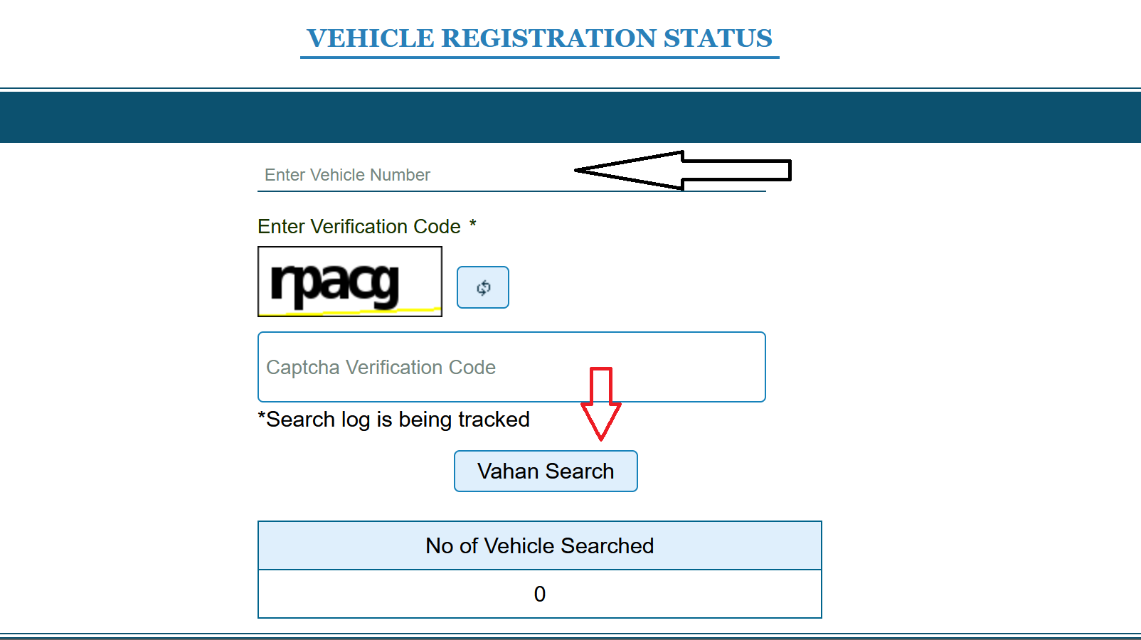 - After logging in, enter the Vehicle Registration Number and the captcha code.