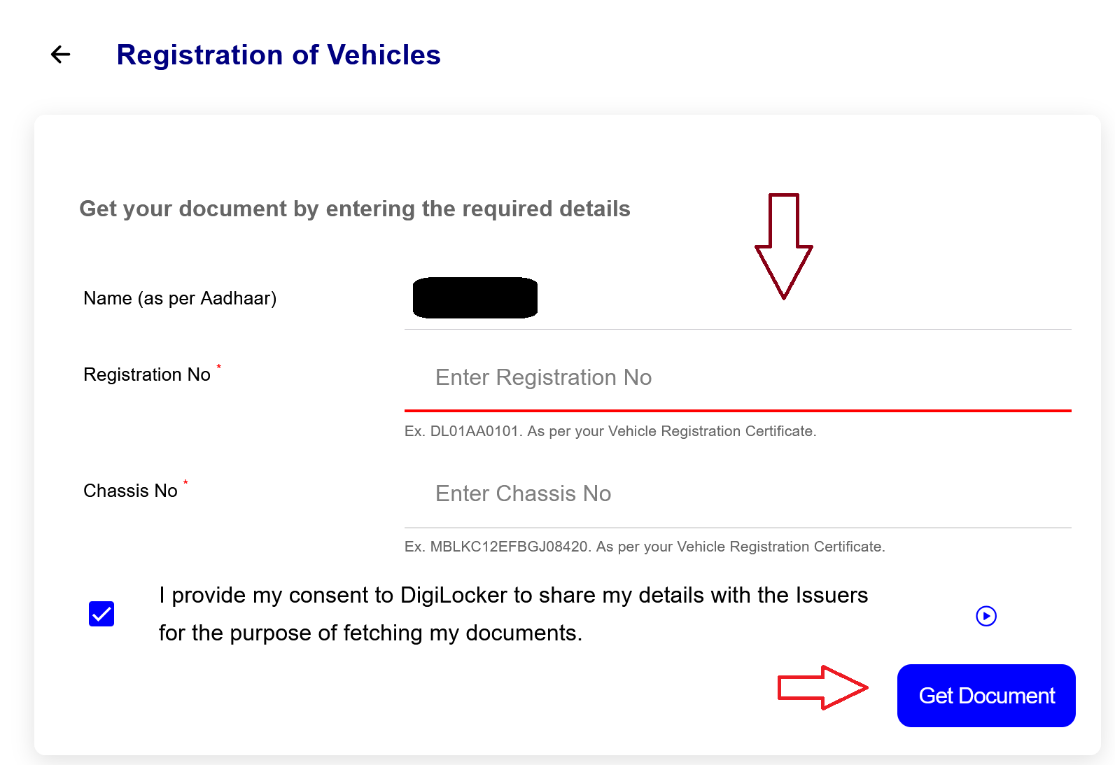 - Click on the Registration of Vehicles option, and Enter your vehicle registration number, and chassis number.