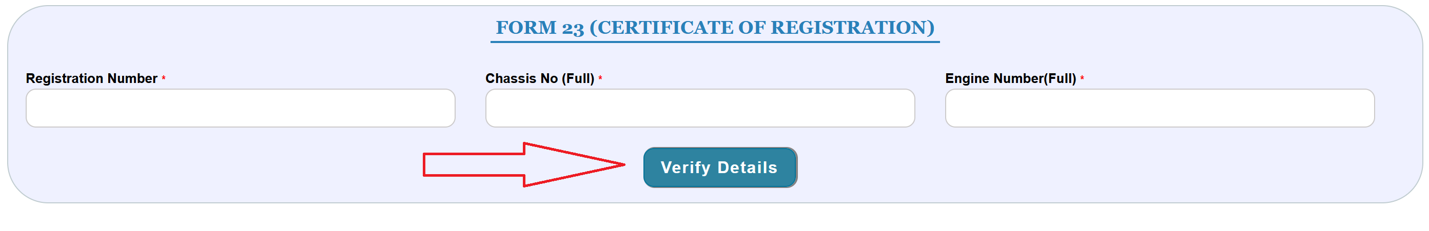 - Enter your vehicle registration number and chassis number (Full). Some states also ask for the engine number. Click “Verify Details”